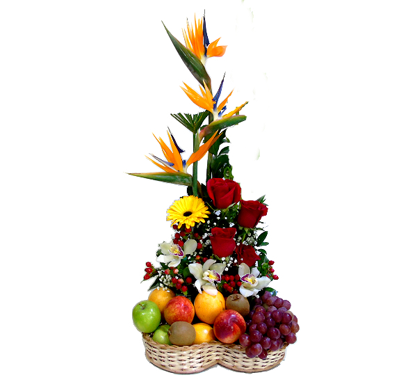 arreglo flores y frutas. aves de paraíso , rosas y orquídeas , mas complementos.